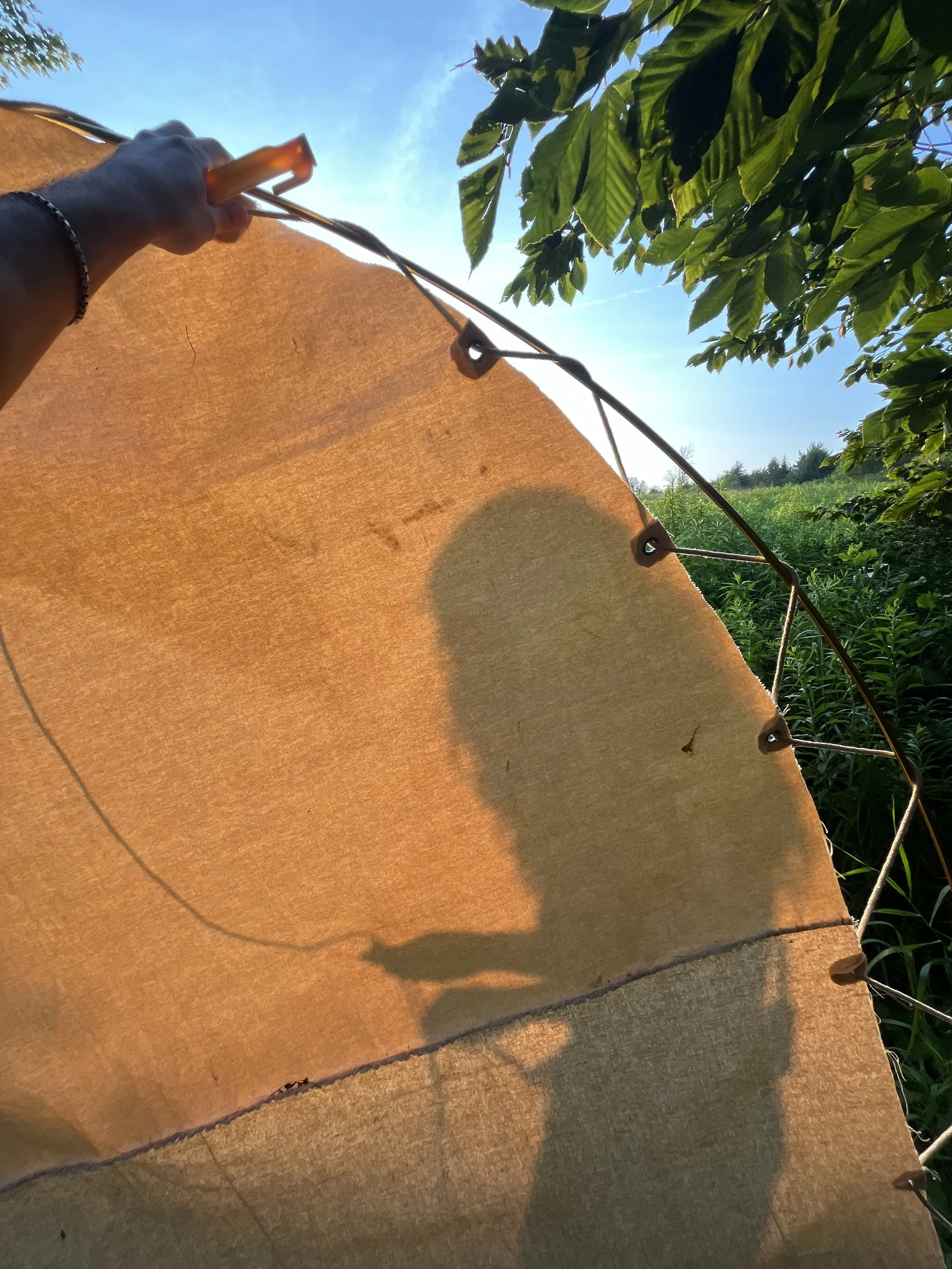 I conduct ‘mothing’ events, inviting people to observe insects on sculptural mothing stations she makes and illuminates with special lights. Mothing is a night practice, and she uses this framework to produce a series of cyanotypes on lightweight fabric of the various species of moths and other insects that show up. Carefully remaining as faithful to their night-of arrangement as possible, the results are an ethereal constellation of suspended activity. The project offers an opportunity to observe and identify species, highlighting biodiversity, while capturing an image that showcases the dazzling beauty of moths. The information also serves as raw material to inform my standalone paintings. Painting on muslin allows the color to seep in and create a soft, naturalistic effect that’s conducive to detailing the moth’s markings. Flowing acrylic creeps and soaks, suggesting a surface in motion or a kind of ‘aliveness.’ A meditation on the form in such a way as to be past what is materially exact, something less knowable- but akin to the fact of beauty we find in organic life.